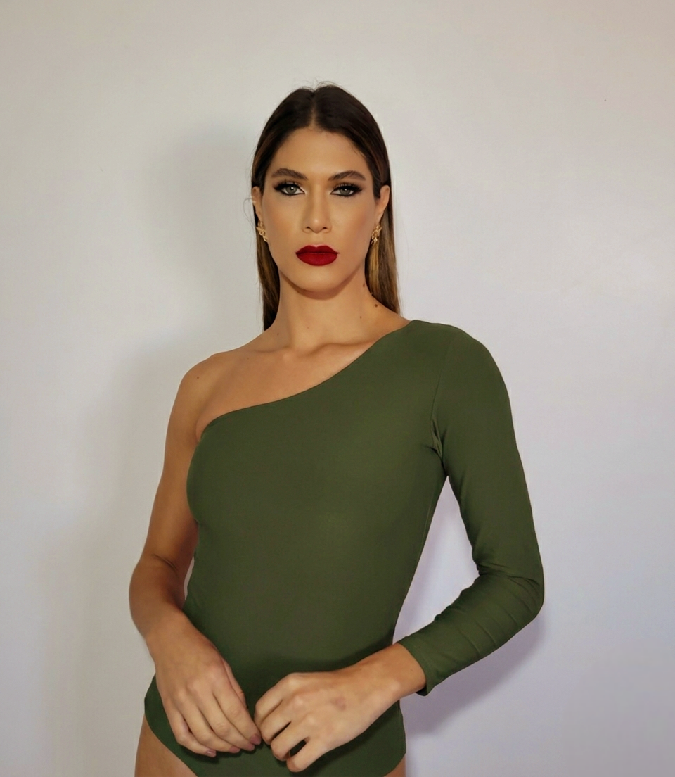 O body de um ombro só e manga longa é sofisticado e versátil, realçando a silhueta com sua modelagem assimétrica, podendo ser usado com alfaiataria para um look elegante ou com jeans e salto para um visual moderno e sensual.